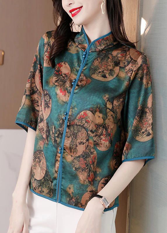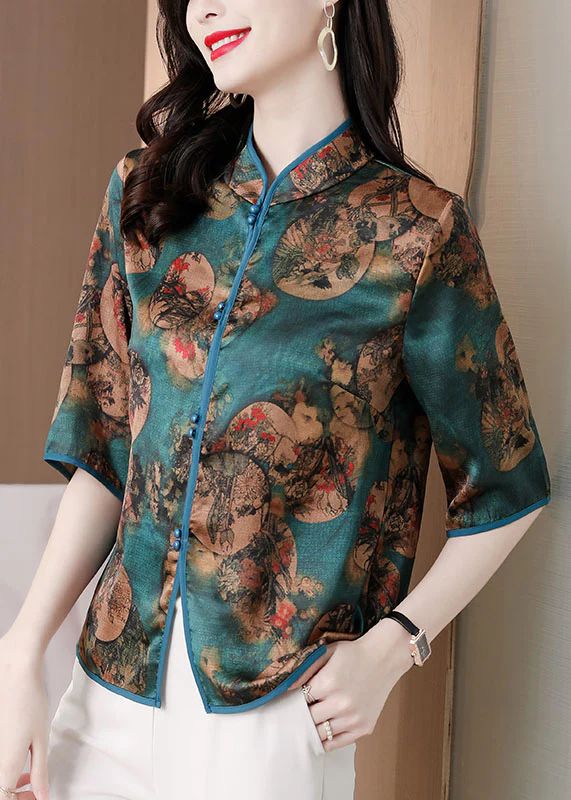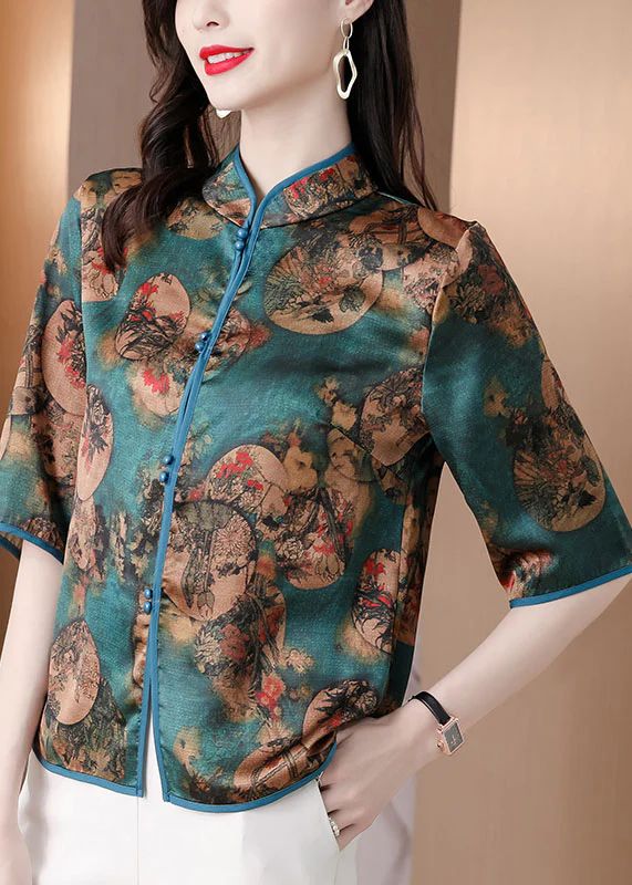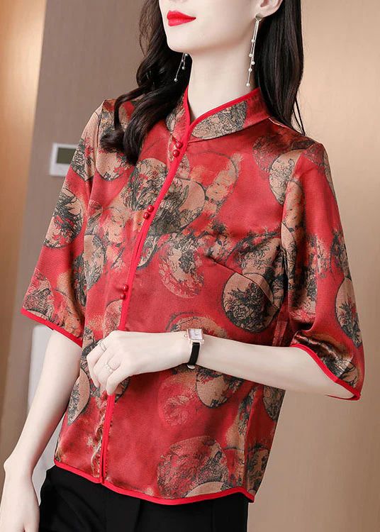 Slim Fit Red Stand Collar Button Print Silk Shirts Half Sleeve